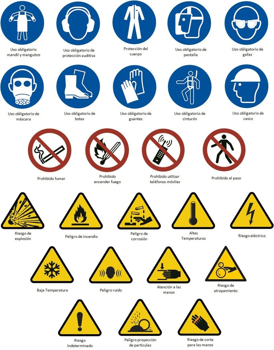 Señal con pictogramas básicos de obligación (azul), advertencia (amarillo) y prohibición (rojo). útil para entrada a obras, naves, etc...