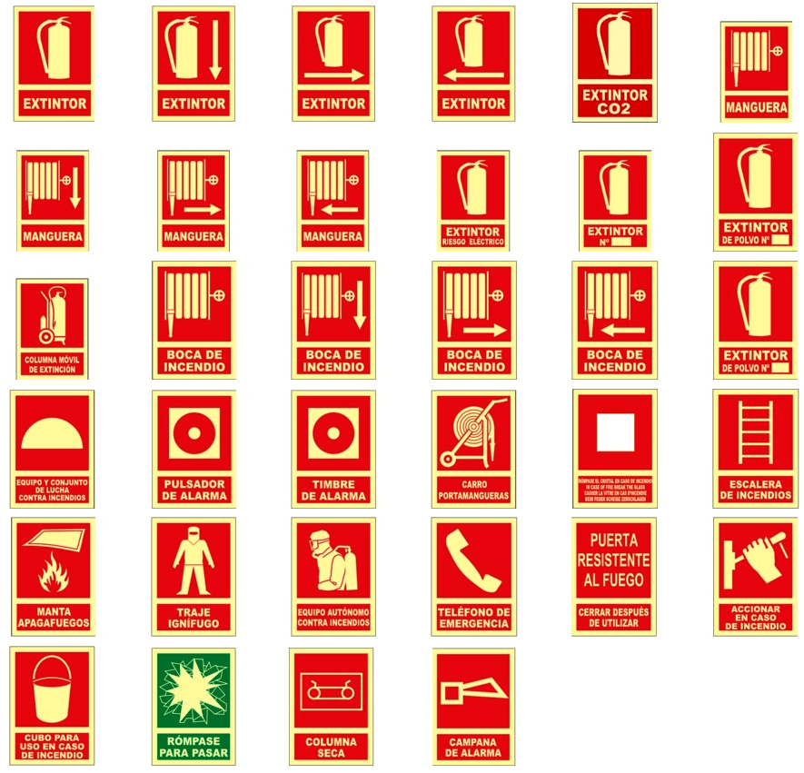 Señales y Banderolas CLASE B fotoluminiscente de extinción certificadas (a fecha de Enero de 2005) según normas: UNE 1115:1985 - Sobre colores y formas UNE 23033:1981 - Sobre pictogramas UNE 23035/1:2003 - Sobre medida de luminiscencia y que cumple los Reales Decretos: 485:1997 (Sobre señalización de seguridad) 2177:1996 - Norma Básica de Edificación (NBE-CPI:96) 2267:2004 - Reglamento de seguridad contra incendios en establecimientos industriales. (RSCIEI).